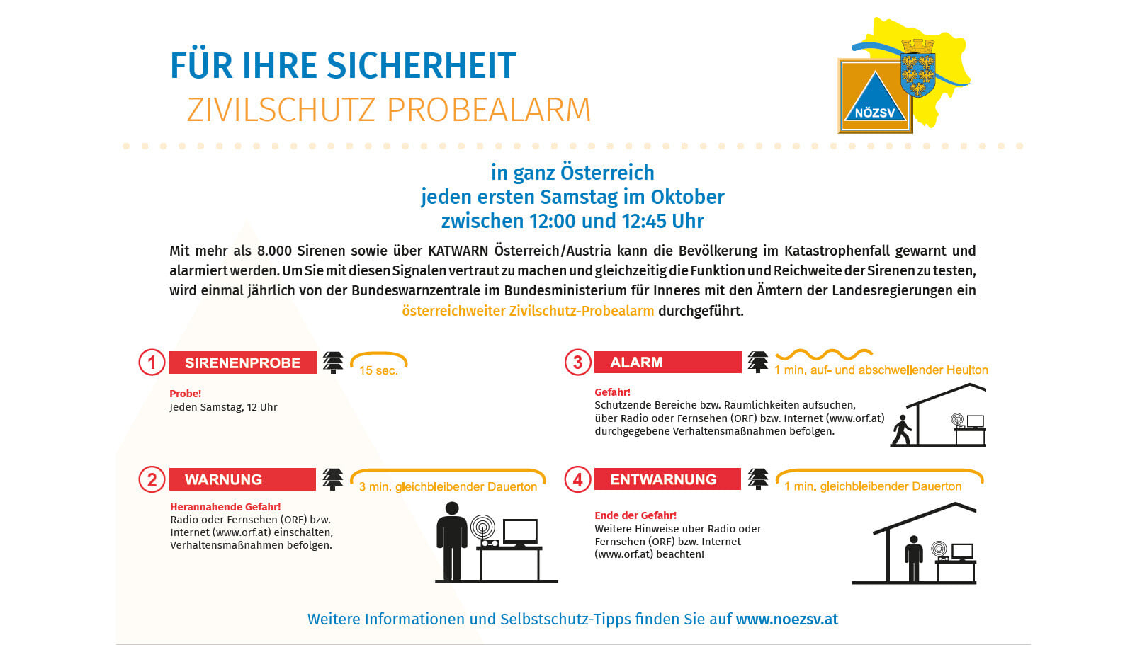 Zwischen 12 und 12.45 Uhr werden nach dem Signal „Sirenenprobe“ die drei Zivilschutzsignale „Warnung“, „Alarm“ und „Entwarnung“ in ganz Österreich ausgestrahlt.